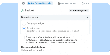 | | | | Đảm bảo chiến dịch của bạn có nhiều nhóm quảng cáo. |  | Trong phần chiến lược ngân sách, chọn Ngân sách nhóm quảng cáo và đảm bảo bạn chọn mục Chia sẻ ngân sách nhóm quảng cáo. Sau đó, nhấp vào Tiếp. |